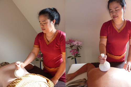 Le massage thaï aux plantes est l’application d’une compresse d’herbes médicinales chauffée à la vapeur, sur l’ensemble du corps. Les plantes fraîches sont broyées, mélangées puis placées dans un linge en coton appelé “ballot”. Chauffées à la vapeur, ces plantes (gingembre, acacias, citronnelle, eucalyptus, curcuma , camphre, menthe…) libèrent leurs principes actifs. Ce massage est idéalement combiné avec un massage thaï traditionnel ou aux huiles.